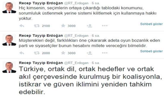Cumhurbaşkanı Recep Tayyip Erdoğan dün akşam MÜSİAD iftarında yaptığı açıklamaların ardından resmi twitter hesabından da koalisyonla ilgili açıklamalar yaptı. Erdoğan, 'oyun bozanlık edenler hesabını vereceğini bilmelidir' dedi. Cumhurbaşkanı Recep Tayyip Erdoğan , takipçileriyle resmi twitter hesabından koalisyonla ilgili görüşlerini paylaştı.