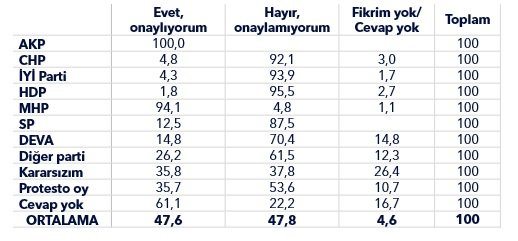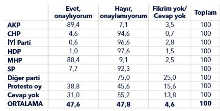 Katılımcıların yüzde 47.8'i "Onaylıyorum", yüzde 47.6'sı "Onaylamıyorum", yüzde 4.6'sı ise "Fikrim yok, cevap yok" şeklinde yanıt verdi.