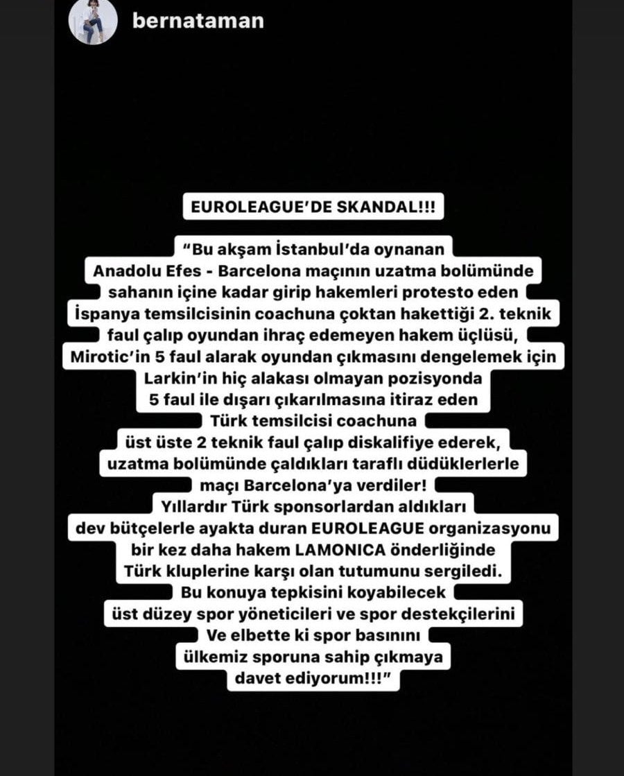 "Bu akşam İstanbul'da oynanan Anadolu Efes - Barcelona maçının uzatma bölümünde sahanın içine kadar girip hakemleri protesto eden İspanya temsilcisinin koçuna çoktan hak ettiği 2. teknik faulü çalıp oyundan ihraç edemeyen hakem üçlüsü, Mirotic'in 5 faul alarak oyundan çıkmasını dengelemek için Larkin'in hiç alakası olmayan pozisyonda 5 faul ile dışarı çıkarılmasına itiraz eden Türk temsilcisi koçuna üst üste 2 teknik faul çalıp diskalifiye ederek uzatma bölümünde çaldıkları taraflı düdüklerle maçı Barcelona'ya verdiler. Yıllardır Türk sponsorlardan aldıkları dev bütçelerle ayakta duran Euroleague organizasyonu bir kez daha hakem Lamonica önderliğinde Türk kulüplerine karşı olan tutumunu sergiledi. Bu konuya tepkisini koyabilecek üst düzey Spor yöneticileri ve spor destekçilerini ve elbette ki spor basınını ülkemiz sporuna destek çıkmaya davet ediyorum."