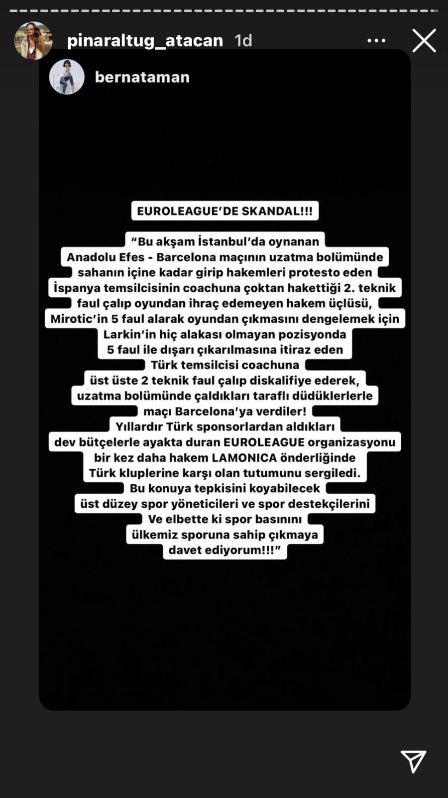 Berna Ataman'ın paylaşımını Pınar Altuğ da sosyal medya hesabından paylaşarak Ataman'a destek verdi.