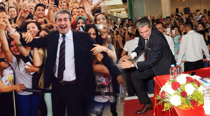 Petekkaya'nın söyleşi için sahneye çıkmasıyla bir anda çığlıklar yükseldi. Ünlü oyuncuyu yakından görebilmek ve fotoğraf çekmek için izdihama neden olan Mersinliler, sandalye ve sahne platformlarını yere indirdi.