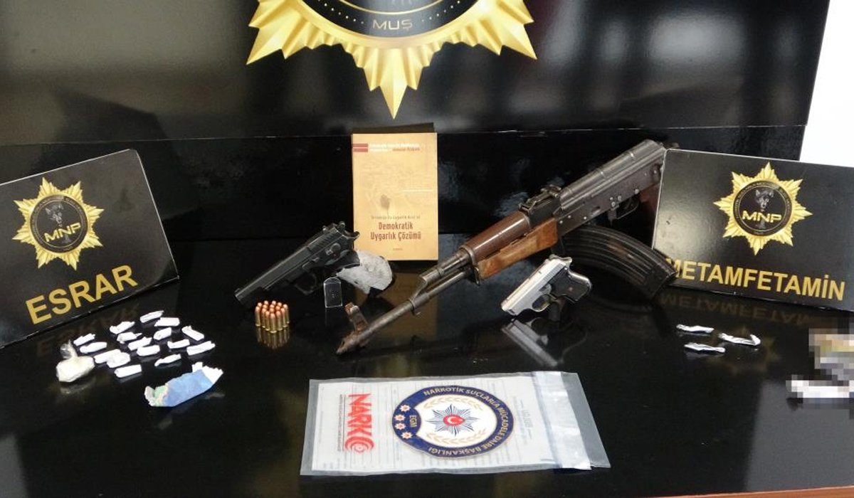 Adres, eklenti ve iş yerlerinde narkotik köpekleri ve dronların da kullanıldığı aramalarda 2 kalaşnikof ve bunlara ait 87 fişek, 5 adet ruhsatsız tabanca ve bunlara ait 4 şarjör ile 38 mermi, terör örgütü PKK’ya ait yasaklı olduğu değerlendirilen 1 kitap, 31,67 gram esrar maddesi, 17,03 gram metamfetamin maddesi ile 1,84 gram sentetik uyuşturucu madde ele geçirildi.