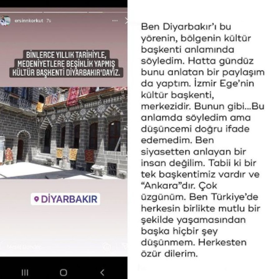 Oyuncu Ersin Korkut, "Diyarbakır'ı bu yörenin bölgenin kültür başkenti anlamında söyledim. Tabii ki bir tek başkentimiz vardır ve Ankara'dır" diyerek özür diledi.