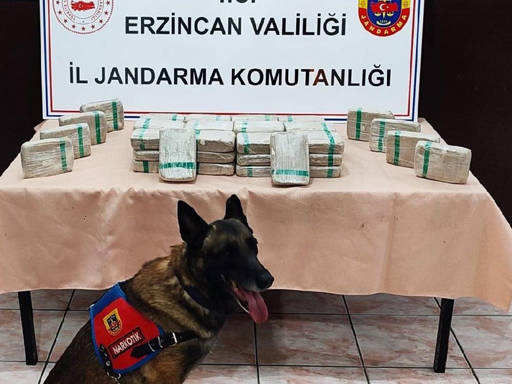 Tercan ilçesi Mercan Jandarma Karakol Komutanlığı Yol Kontrol ve Arama Noktasında 1 şüpheli şahsa ait TIR içerisinde uyuşturucu madde arama köpeği ‘Avcı’ ile birlikte yapılan arama neticesinde; 25 kilo 720 gram eroin ele geçirildi.