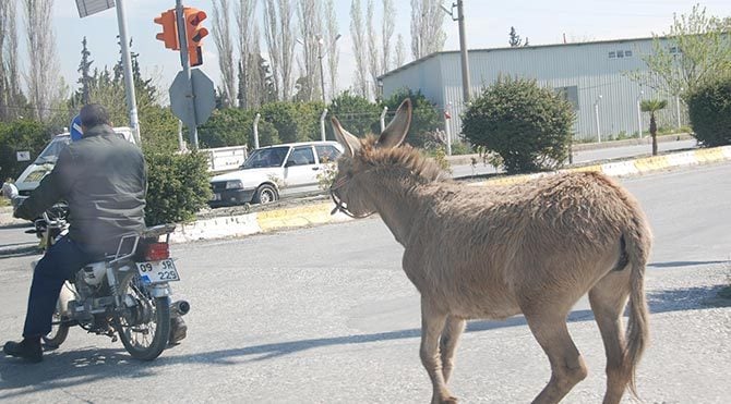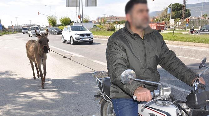 Motosiklete yetişmek için koşarken zaman zaman asfaltta kayan eşeğin durumu çevredekilerin yüreğini sızlattı. Motosikletine bağladığı eşeğin koşarken zaman zaman asfaltta ayağının kayıp tökezlemesi trafikte zor anlar yaşanmasına yol açtı.