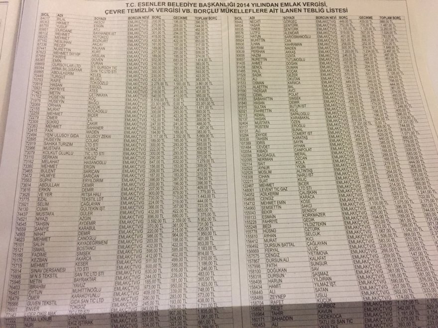 İşte Esenler Belediyesi'nin vergi borçlularını duyurduğu ilanın bir kısmı: