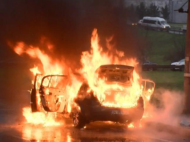 İstanbul'da D-100 karayolu yan yol Esenyurt mevkiinde bir otomobilde çıkan yangın, itfaiye ekiplerince söndürüldü. Otomobilin alev alev yandığı anlar kameraya yansıdı.