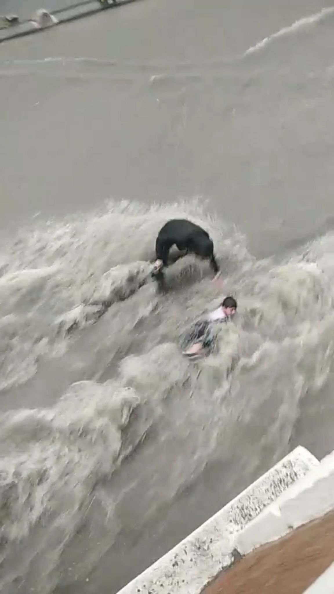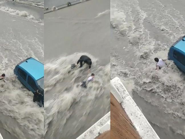 O anlar ise cep telefonu kamerası ile kaydedildi. Görüntülerde, üç kişi yolun karşısına geçmeye çalışırken çocuk sel sularına kapılıyor. Güçlükle araba tamponuna tutunan çocuk, kurtarılıyor. Bir diğer görüntüde de kadın sel sularına kapılıyor. Kadın, vatandaşlar tarafından yol kenarına çekilerek kurtarılıyor. (DHA)