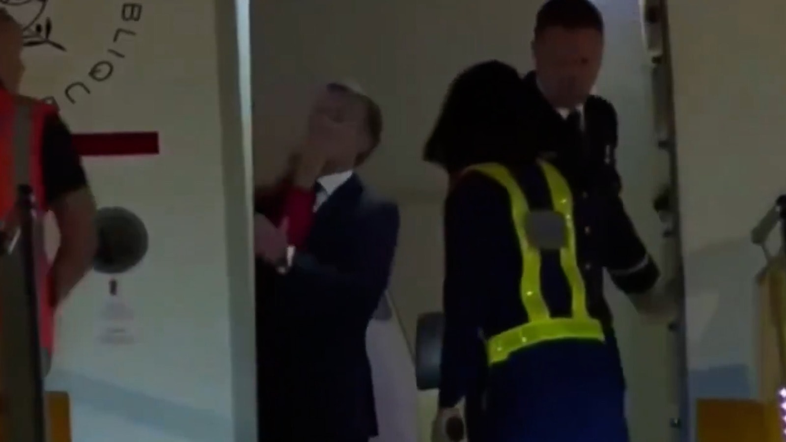 Görüntüde Brigitte Macron’un yüzü görünmüyor. Macron ise kısa süreli bir şaşkınlığın ardından dışarıya selam vererek yürümeye başlıyor.