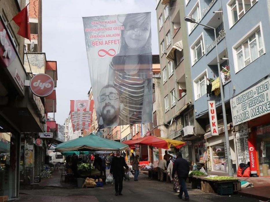Samsun’da kendisi gibi esnaf olan eşiyle tartışan Suat Dağ, 2 aydır kendisiyle konuşmayan eşinden sokağa astığı dev pankartla özür diledi.