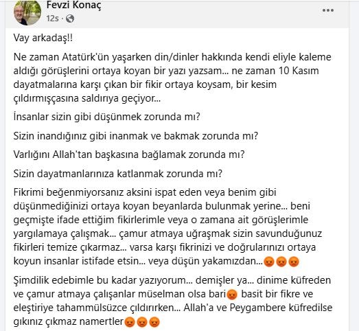 “Vay arkadaş!! Ne zaman Atatürk'ün yaşarken din/dinler hakkında kendi eliyle kaleme aldığı görüşlerini ortaya koyan bir yazı yazsam... Ne zaman 10 Kasım dayatmalarına karşı çıkan bir fikir ortaya koysam, bir kesim çıldırmışçasına saldırıya geçiyor...İnsanlar sizin gibi düşünmek zorunda mı? Sizin inandığınız gibi inanmak ve bakmak zorunda mı? Varlığını Allah'tan başkasına bağlamak zorunda mı? Sizin dayatmalarınıza katlanmak zorunda mı? Fikrimi beğenmiyorsanız aksini ispat eden veya benim gibi düşünmediğinizi ortaya koyan beyanlarda bulunmak yerine beni geçmişte ifade ettiğim fikirlerimle veya o zamana ait görüşlerimle yargılamaya çalışmak... çamur atmaya uğraşmak sizin savunduğunuz fikirleri temize çıkarmaz... varsa karşı fikrinizi ve doğrularınızı ortaya koyun insanlar istifade etsin... veya düşün yakamızdan. Şimdilik edebimle bu kadar yazıyorum... Demişler ya dinime küfreden ve çamur atmaya çalışanlar müselman olsa bari. Basit bir fikre ve eleştiriye tahammülsüzce çıldırırken... Allah'a ve Peygambere küfredilse gıkınız çıkmaz namertler”