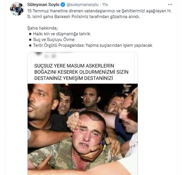 İçişleri Bakanı Süleyman Soylu bu tweeti alıntılayarak şu paylaşımı yapmıştı: