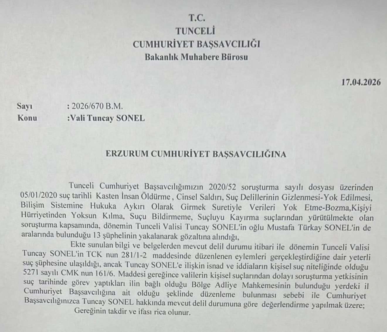 Ekte sunulan bilgi ve belgelerden mevcut delil durumu itibari ile dönemin Tunceli Valisi Tuncay SONEL'in TCK nun 281/1-2 maddesinde düzenlenen eylemleri gerçekleştirdiğine dair yeterli suç şüphesine ulaşıldığı, ancak Tuncay SONEL'e ilişkin isnad ve iddiaların kişisel suç niteliğinde olduğu 5271 sayılı CMK nun 161/6. Maddesi gereğince valilerin kişisel suçlarından dolayı soruşturma yetkisinin suç tarihinde görev yaptıkları ilin bağlı olduğu Bölge Adliye Mahkemesinin bulunduğu yerdeki il Cumhuriyet Başsavcılığına ait olduğu şeklinde düzenleme bulunması sebebi ile Cumhuriyet Başsavcılığınızca Tuncay SONEL hakkında mevcut delil durumuna göre değerlendirme yapılmak üzere; Gereğinin takdir ve ifası rica olunur."