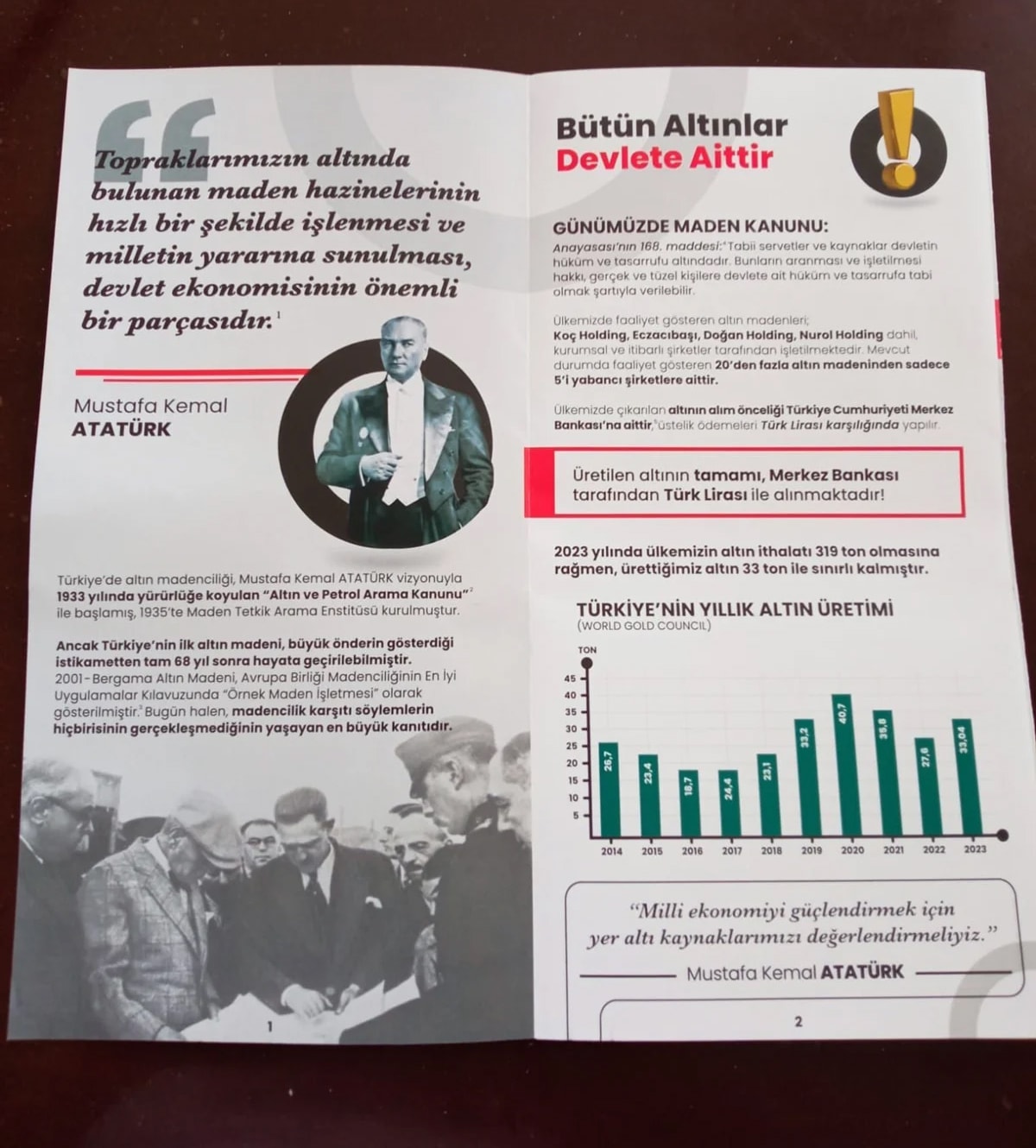 Şirket, Ulu Önder Mustafa Kemal Atatürk’ün fotoğrafının yer aldığı ve “Altın Madenciliği Milli Mücadeledir” başlıklı broşürler bastırıp dağıttı.