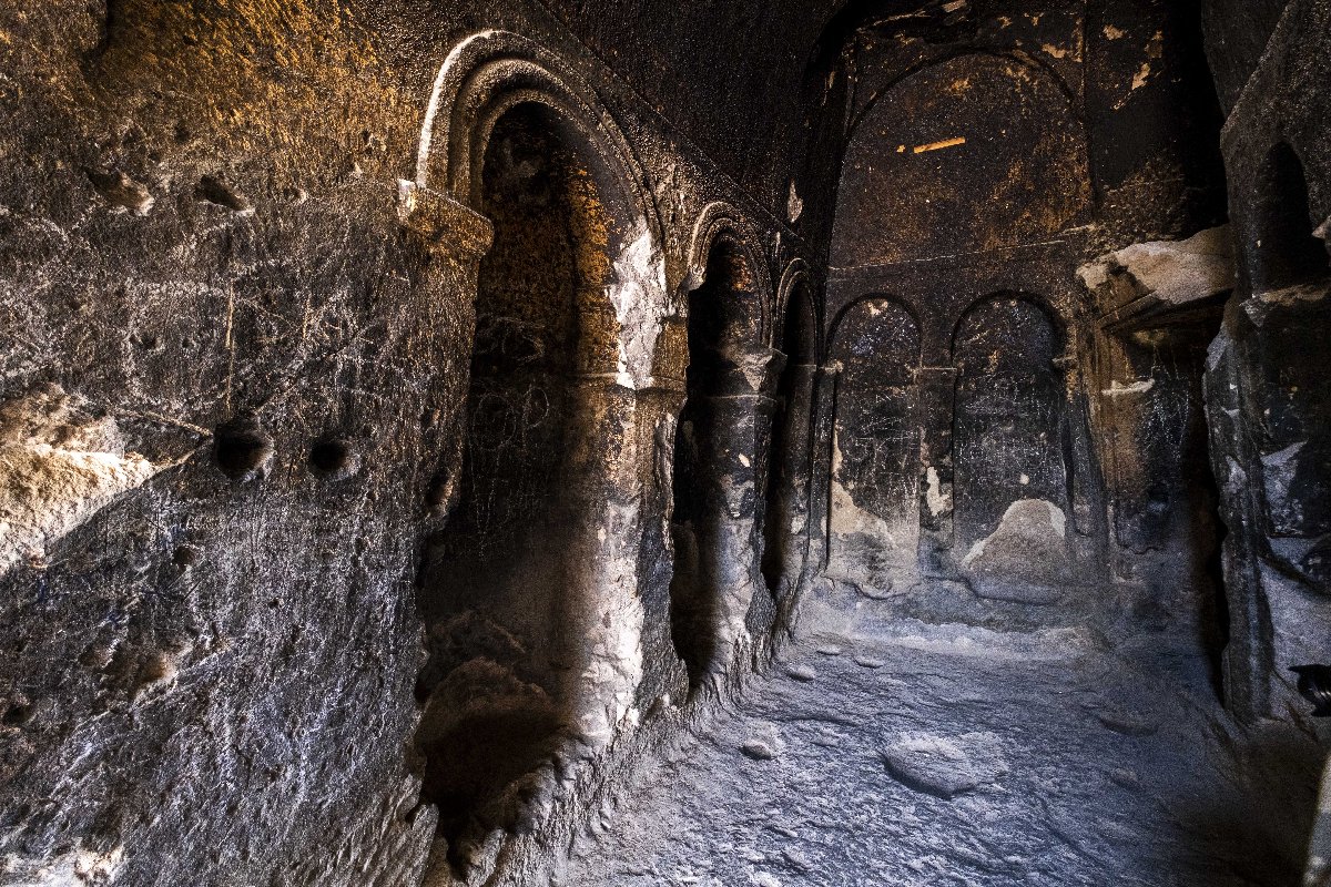 Avdalaz Vadisi’nin girişinin her iki yanındaki kaya evlerin sol yandaki büyük ve çok katlı.. Bu kaya yerleşiminde eğimli tünel çıkışla ulaşılan geniş orta bölümünde dairesel yapılmış duvarda, yan yana koltuk dizileri ile orta boşlukta ocak, depo gibi kullanılan büyük ve derin çukurluklar yer alıyor.