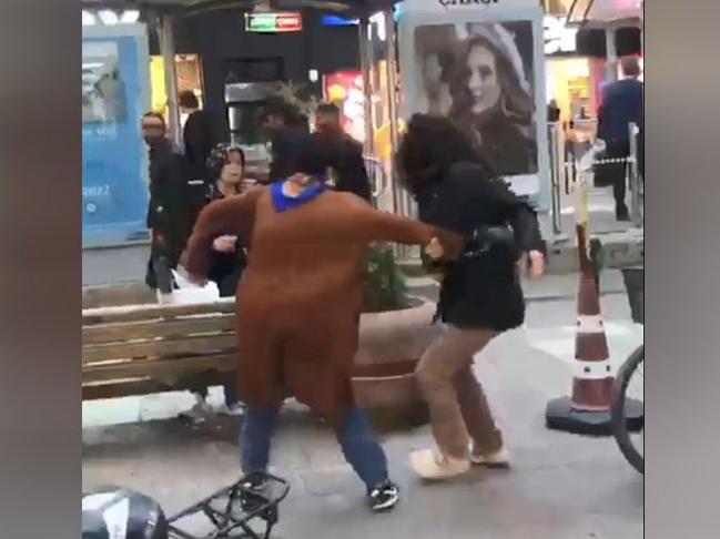 Cep telefonu kamerasıyla kaydedilen ve sosyal medyada paylaşılan görüntülere göre, araya girmeye çalışanlara rağmen saldırısını sürdüren kadın, caddedekilerin tepkisini çekti.