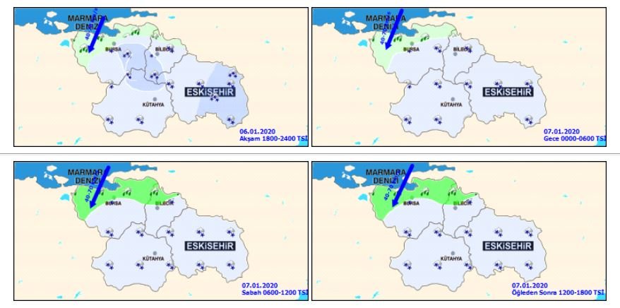 Devam etmekte olan yağışların, Eskişehir, Kütahya il genelinde mevcut durumunu koruyarak, aralıklarla hafif ve mutedil kar şeklinde devam edeceği, Bursa kuzey ve batı kesimlerinde etkisini artırarak kuvvetli yağmur, Bilecik il geneli ile Bursa'nın Güney kesimlerinde yer yer kuvvetli kar ve karla karışık yağmur şeklinde olması beklendiğinden, meydana gelebilecek olumsuzluklara karşı dikkatli ve tedibirli olunması gerekiyor.