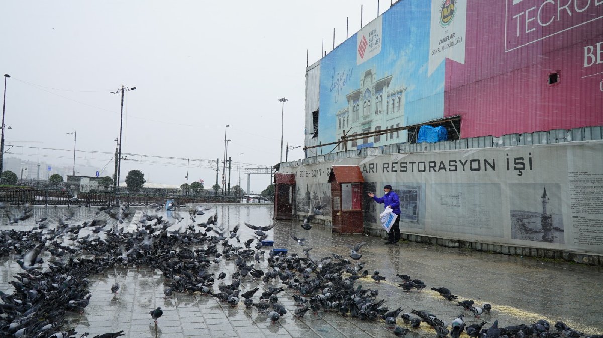 Kısıtlamadan muaf olan ve ‘bir umut’ diyerek dükkan açıp turistleri bekleyen Eminönü esnafı ise hayal kırıklığına uğradı. Havanın soğuk ve kar yağışlı olması sebebiyle turistlerin ziyarete gelmediğini belirten esnaf, semtin simgesi haline gelen güvercinleri de unutmadı. Karda yemek bulmakta zorlanan güvercinlere çuvalla yem dağıtarak besledi. Bir kuruyemişçi esnafı ise elindeki ufak kürekle güvercinleri besledi.