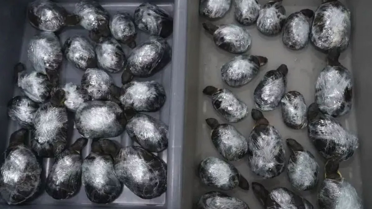 Görevliler arama yapınca kadının bacaklarına siyah çoraplarla sıkıca bağlanmış 39 canlı kaplumbağa buldu. Kısa bir süre sonra aynı yöntemi kullanan ikinci kadın da durduruldu. Onun da eteklerinin altında 29 kaplumbağa sakladığı ortaya çıktı.