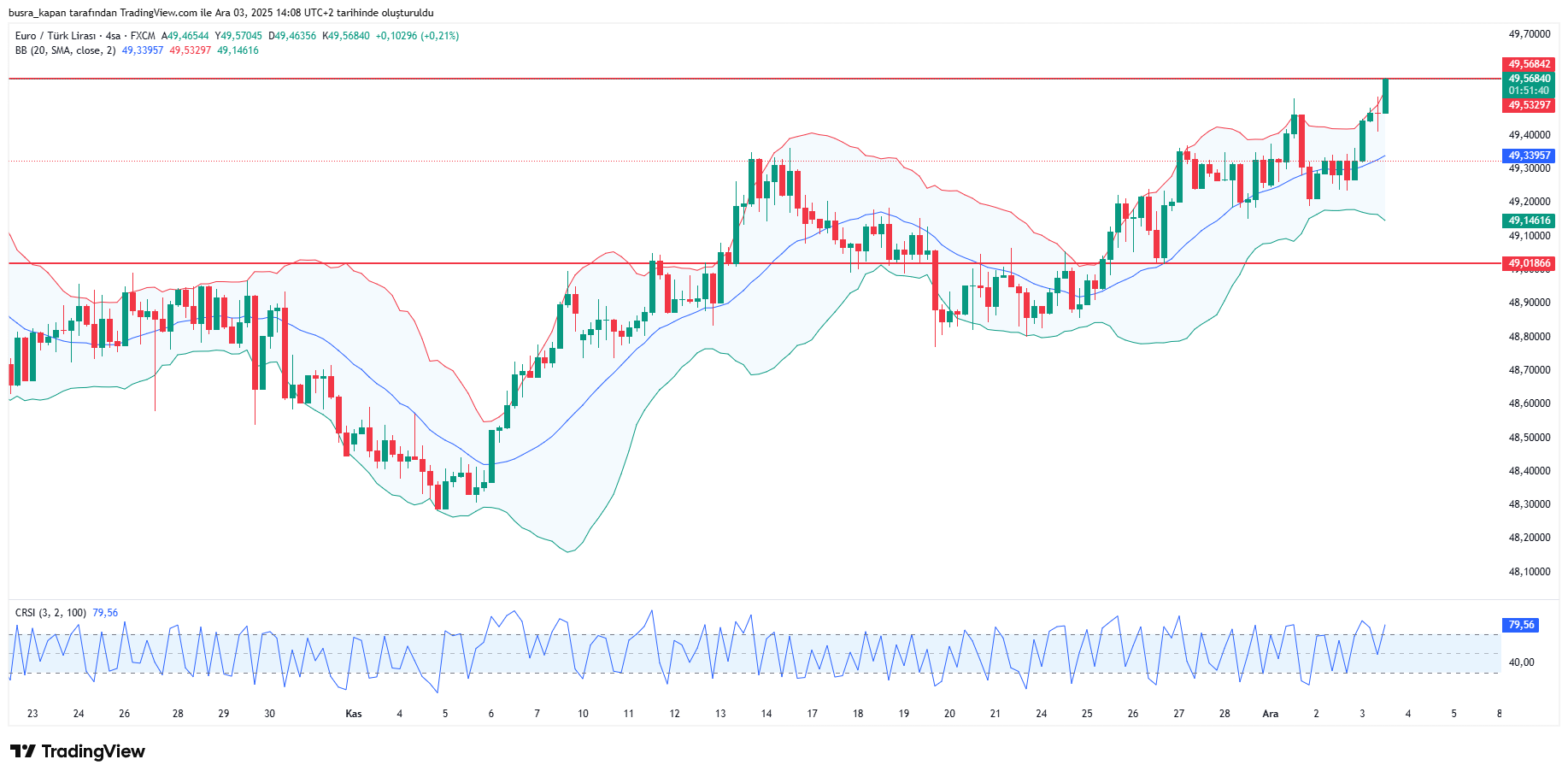 Euro/TL'nin 4 saatlik grafiğinde, günlük trendin bir yansıması olarak güçlü yükseliş momentumunu koruyor; son 10-15 mumda (yaklaşık 40-60 saatlik periyotta) 48.90 TL'den 49.50 TL'ye tırmanarak kanal üst sınırını test ediyor, son mumlar yeşil ve hacimli. RSI (14) %72 civarında aşırı alım sinyali verirken, Bollinger Bands üst bandı (49.60 TL) genişleyen volatiliteyle fiyatı sarıyor.