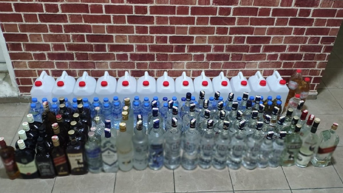Evdeki aramada ise farklı ebatlardaki 124 şişeye doldurulmuş sahte alkollü içki, bidonlar içerisinde 65 litre etil alkol ele geçirildi.