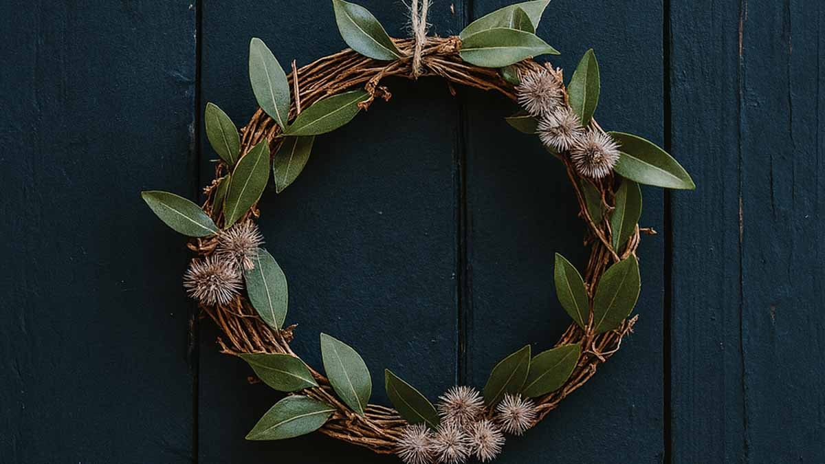 Kurutulmuş defne dalları, sembolik anlamlarının yanı sıra estetik bir değer de sunuyor. Koyu yeşil tonları — zaman zaman altın yansımalarıyla — kapılara doğal, sıcak ve minimalist bir dekoratif dokunuş katıyor.