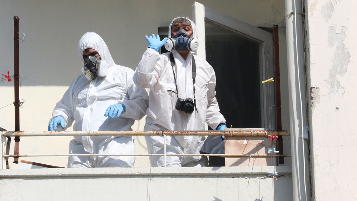 İtfaiye aracının merdiveniyle balkondan girmeye çalışan polis, buradan cesedin olduğu noktaya gidiş olmadığını görünce yan taraftaki pencerenin camı kırıldı. Buradan içeri giren olay yeri inceleme ekibi, cesedin bulunduğu yerde çalışma yaptı. Çevredekiler, polis ve itfaiye ekibinin çalışmasını merakla izledi.