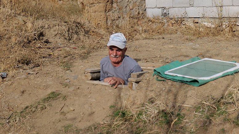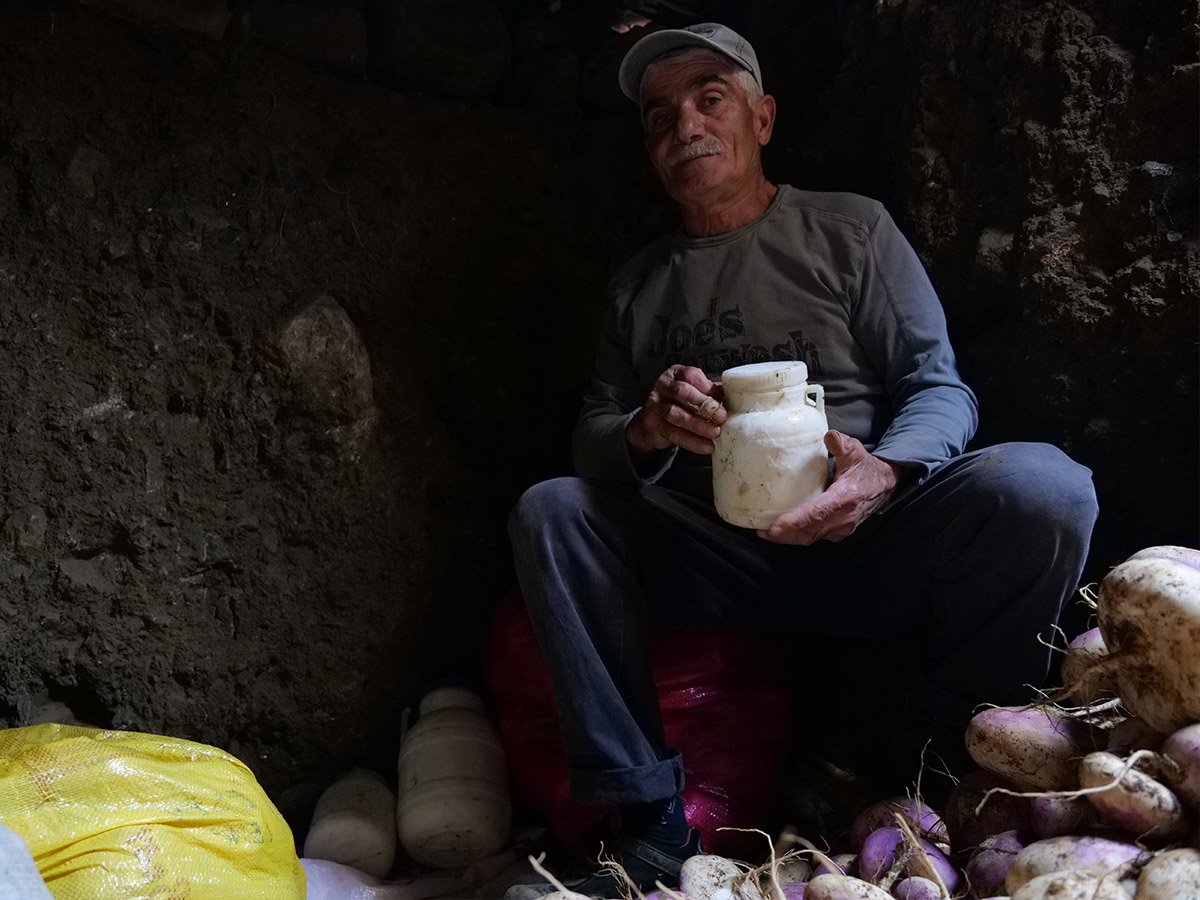 Günebakan köyünde çiftçilik yapan 61 yaşındaki Veysel Kurt, tarlasında yetiştirdiği sebzeler ile ürettiği süt ürünlerini kış boyunca bozulmadan muhafaza etmek için atadan kalma yöntem kullanıyor.