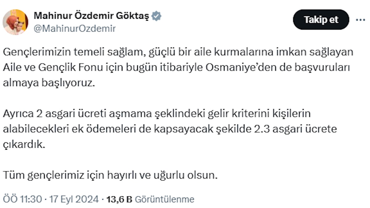 “Gençlerimizin sağlam temellere dayanan, güçlü aileler kurabilmeleri için hayata geçirdiğimiz Aile ve Gençlik Fonu, artık Osmaniye ilimizde de başvurulara açıldı. Ayrıca gelir kriterini genişleterek, 2 asgari ücret sınırını 2.3 asgari ücrete çıkardık. Bu düzenleme, gençlerimize daha geniş bir destek sağlayacak. Tüm gençlerimiz için hayırlı olsun.”