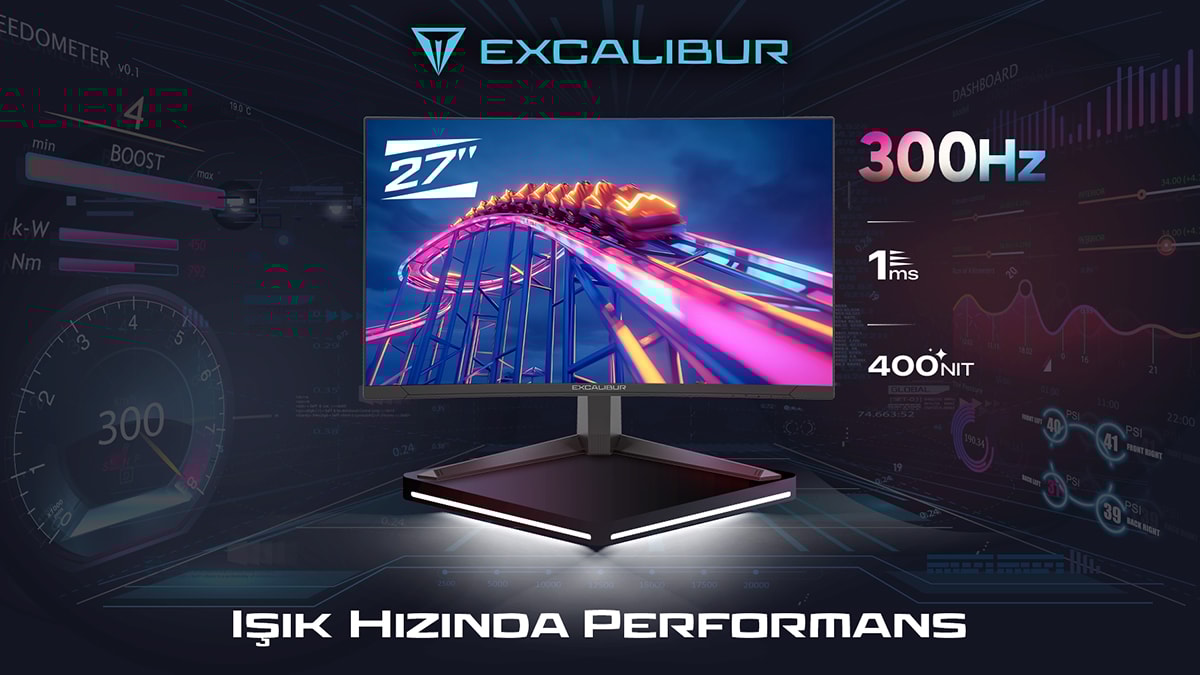 300 Hz yenileme hızıyla kategorisinde bir ilke imza atan Excalibur 27” monitör, 1 ms tepki süresiyle FPS oyunlarında akıcı bir deneyim sağlıyor. AMD FreeSync™ ve NVIDIA® G-SYNC® teknolojilerini barındıran cihaz, ekran kartı ile senkronize çalışarak görüntüdeki bozulma ve takılmaları ortadan kaldırıyor. 400 NIT parlaklık, HDR10 desteği ve %100 sRGB renk gamıyla monitör, oyunlardan sinematik deneyimlere kadar her alanda görsel bir şölen sunuyor.
