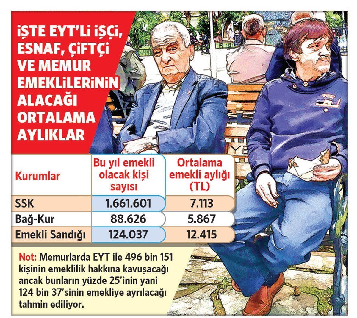 SGK kaynakları, kurumun her yıl ortalama 400 ila 450 bin kişiyi emekli ettiğini, bunun da ayda ortalama 33 bin ila 37 bin emekliye karşılık geldiğini söylediler. Gece gündüz fazla mesai yapılarak ayda belki 100 bin EYT'linin emeklilik işleminin tamamlanabileceğini belirten SGK yetkilileri, ilk etapta başvurması beklenen 1 milyonu aşkın EYT'linin dosya incelemesinin yıl sonuna, hatta gelecek yılın başına kadar sürebileceğini ifade ettiler.