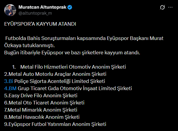 - Futbolda Bahis Soruşturmaları kapsamında Eyüpspor Başkanı Murat Özkaya tutuklanmıştı. Bugün itibariyle Eyüpspor ve bazı şirketlere kayyum atandı.
