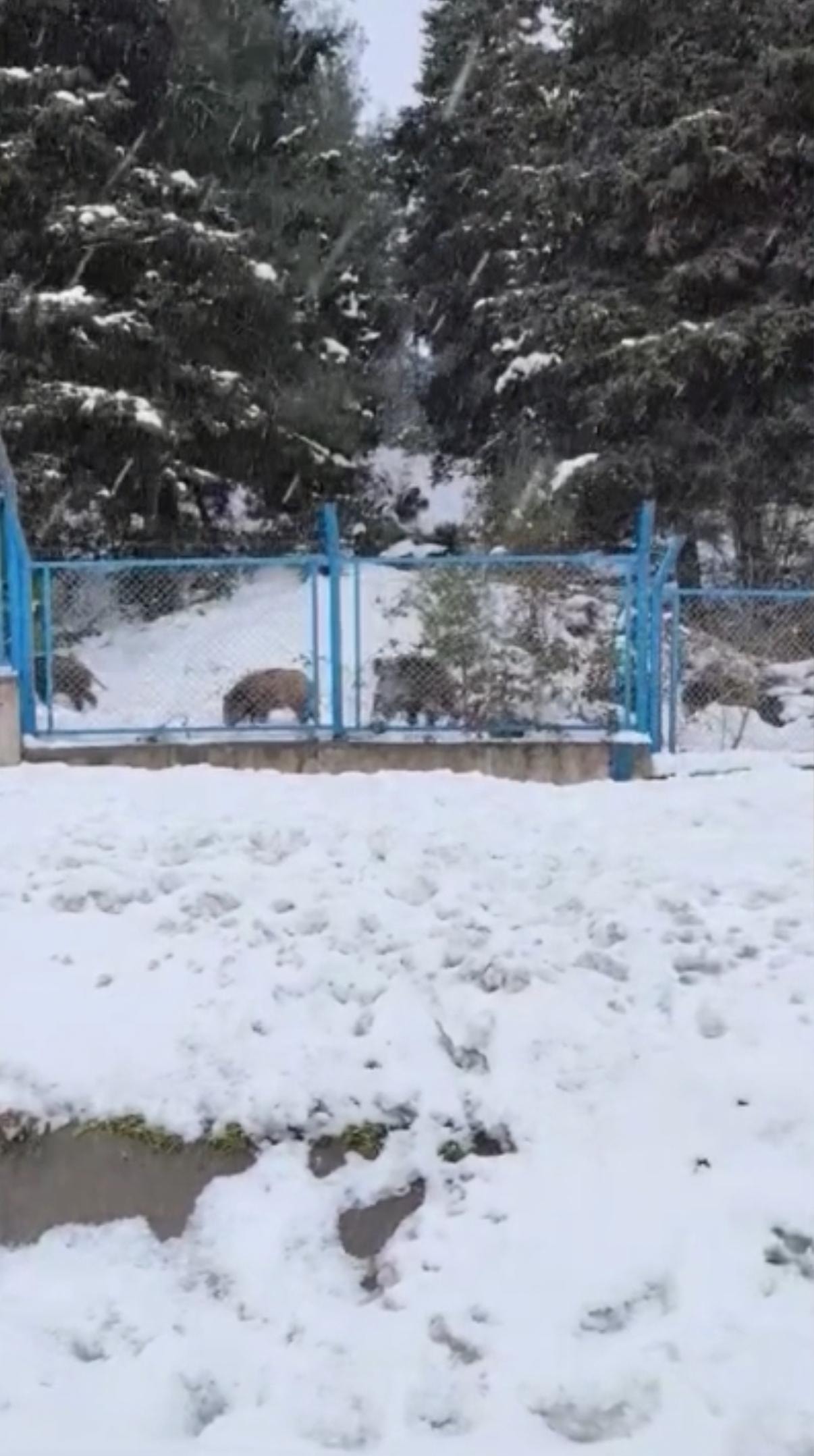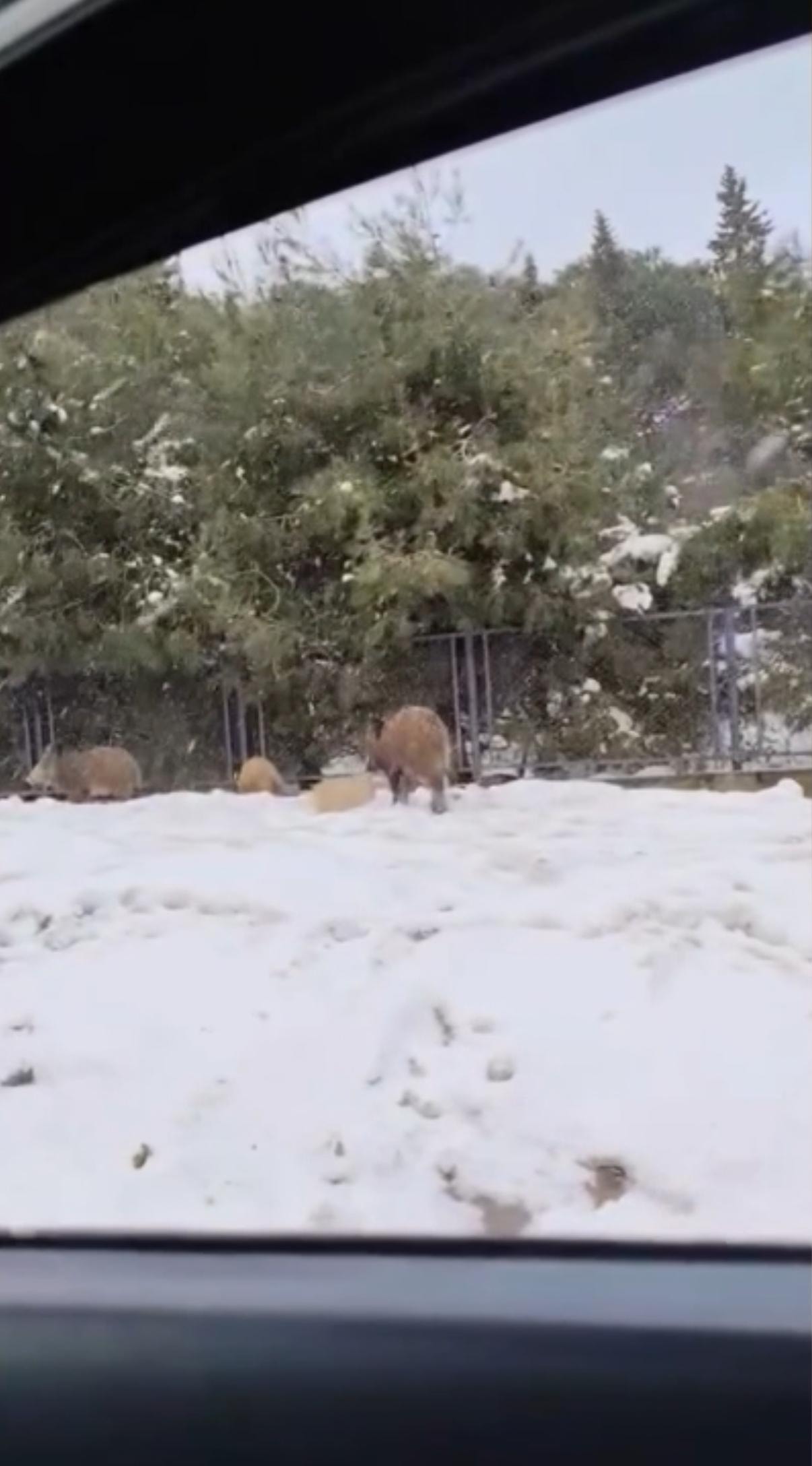 İstanbul’daki etkili kar yağışı, şehri beyaza bürüdü. Yağışın ardından Eyüpsultan Hasdal mevkisinde, yiyecek bulamayan bir domuz sürüsü, yiyecek aramak için yola indi.