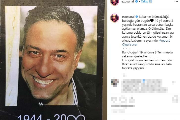 Türk sinemasının ustası Kemal Sunal'ın kızı Ezo Sunal, babasının 19'uncu ölüm yıl dönümünde sosyal medya hesabından duygusal bir paylaşımda bulundu.