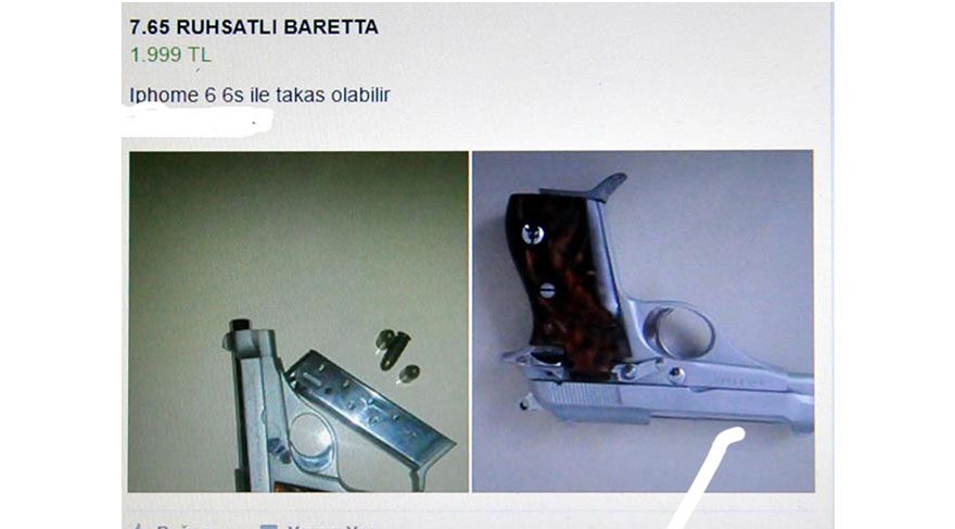 Sosyal paylaşım sitesi Facebook’ta ’2. El Alım, Satım ve Takas’ konusunda yayın yapan grupta, sayfasındaki bilgilere göre 16 yaşında ve lise öğrencisi olan T.Y., fotoğraflarını paylaştığı 7.65 milimetre çapındaki ruhsatlı tabancayı cep telefonu ile takas etmek istedi. Satılık tabancanın ruhsatlı olduğunu yazan Y.T., 1999 TL fiyat belirlediği silahı, piyasadaki en pahalı marka ve modellerden olan bir cep telefonu ile takas edebileceğini paylaştı.