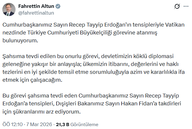 "Cumhurbaşkanımız Sayın Recep Tayyip Erdoğan’ın tensipleriyle Vatikan nezdinde Türkiye Cumhuriyeti Büyükelçiliği görevine atanmış bulunuyorum.