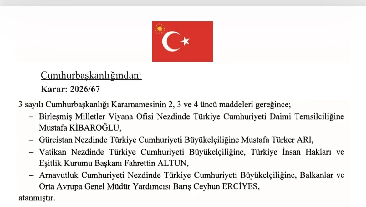 Karara göre ayrıca; Birleşmiş Milletler Viyana Ofisi Türkiye Cumhuriyeti Daimi Temsilciliğine Mustafa Kibaroğlu, Gürcistan Büyükelçiliği'ne Mustafa Türker Arı, Arnavutluk Büyükelçiliği'ne, Balkanlar ve Orta Avrupa Genel Müdür Yardımcısı Barış Ceyhun Erciyes atandı.