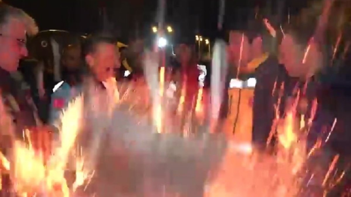 Hatay'da Sağlık Bakanı Fahrettin Koca ile sağlık çalışanlarının sohbeti sırasında önlerinde yakılan ateşteki kor parladı. Kimsenin yaralanmadığı olay anı kameraya yansıdı.
