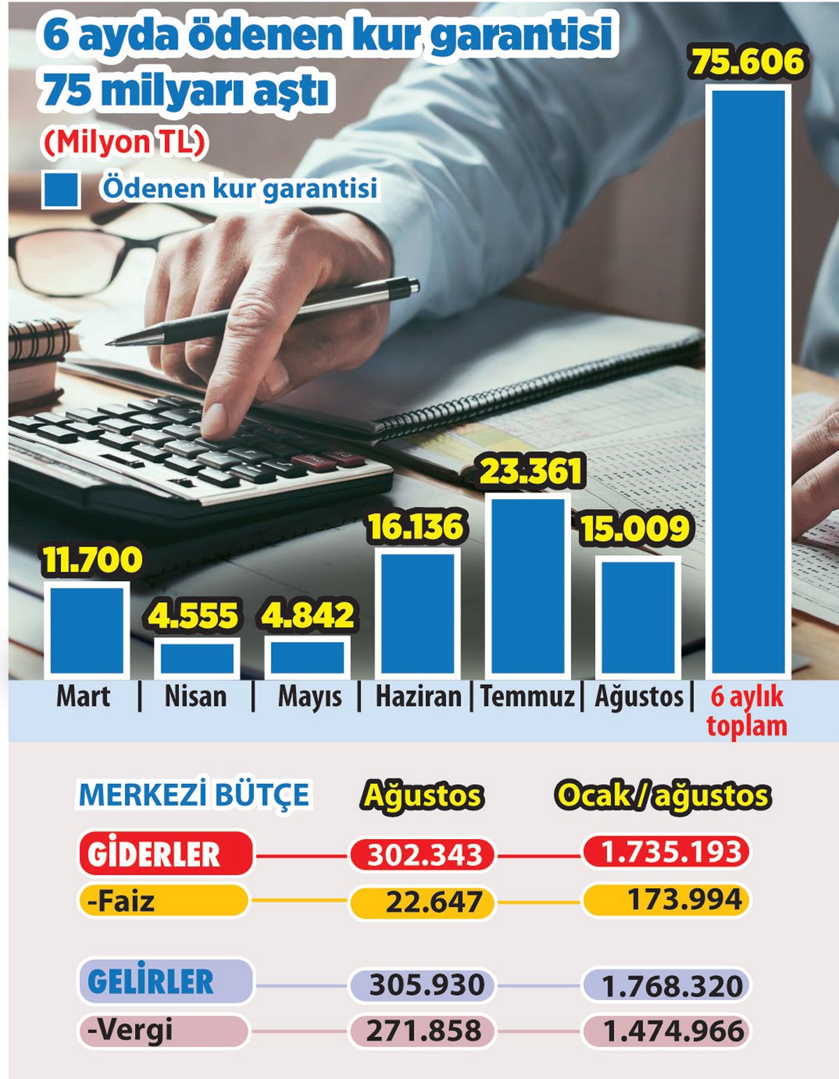 Mevduat sahiplerine ağustos ayında kur garantisi adı altında 15 milyar 10 milyon lira daha ödeme yapıldı. Böylece halktan toplanan vergilerle oluşturulan bütçe kaynaklarından mevduat sahibi varlıklı kesime mart ayından bu yana aktarılan para 75 milyar 606 milyon lirayı aştı. TOKİ’nin yaptıracağı söylenen 2+1 konutlar en düşük 608 bin liradan, 3+1 konutlar da en düşük 850 bin liradan 240 ay vadeyle dar gelirlilere satılacak. Kur garantisi adı altında 6 ayda varlıklı kesime ödenen parayla TOKİ’nin 3+1 konutlarından 88 bin 949 adet, 2+1 konutlarından ise 124 bin 353 adet alınabiliyor.