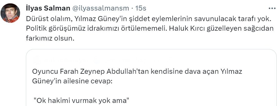 Abdullah'ın sözlerini destekleyen bir paylaşım yapan İlyas Salman ise "Dürüst olalım, Yılmaz Güney'in şiddet eylemlerinin savunulacak tarafı yok. Politik görüşümüz idrakımızı örtülememeli. Haluk Kırcı güzelleyen sağcıdan farkımız olsun" ifadelerini kullandı.