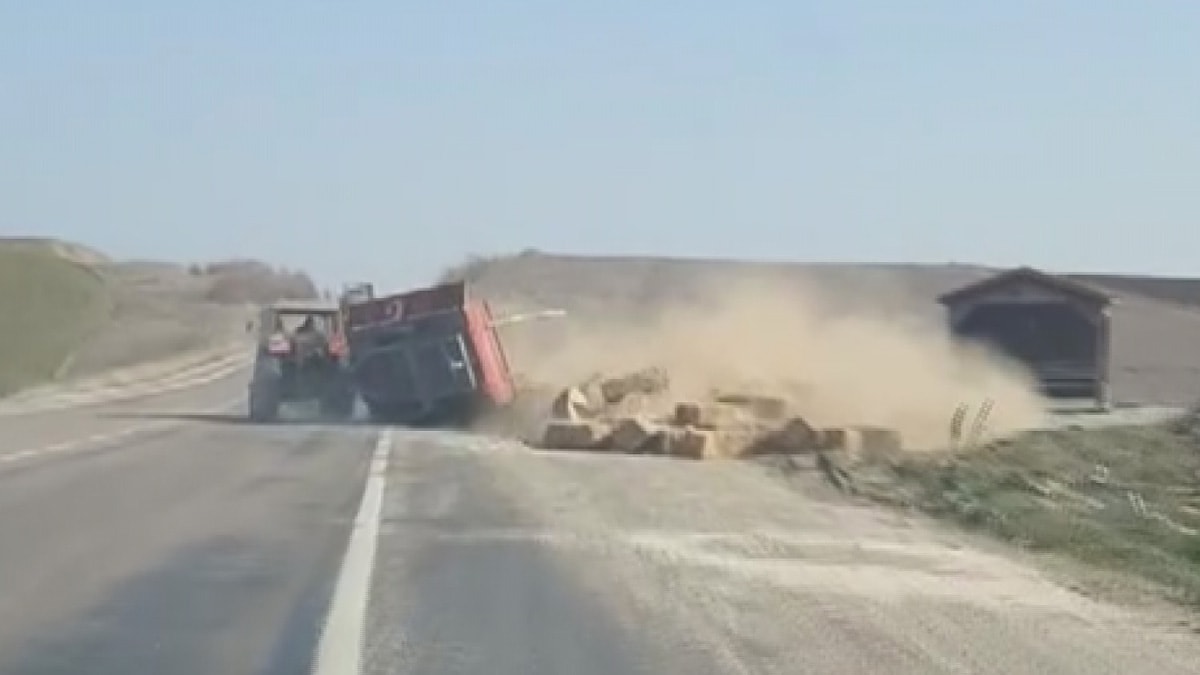 Görüntülerde, dengesiz yüklenen traktör römorkunun bir süre tehlikeli şekilde ilerlediği, ardından yükün ağırlığına dayanamayarak devrildiği anlar yer aldı.