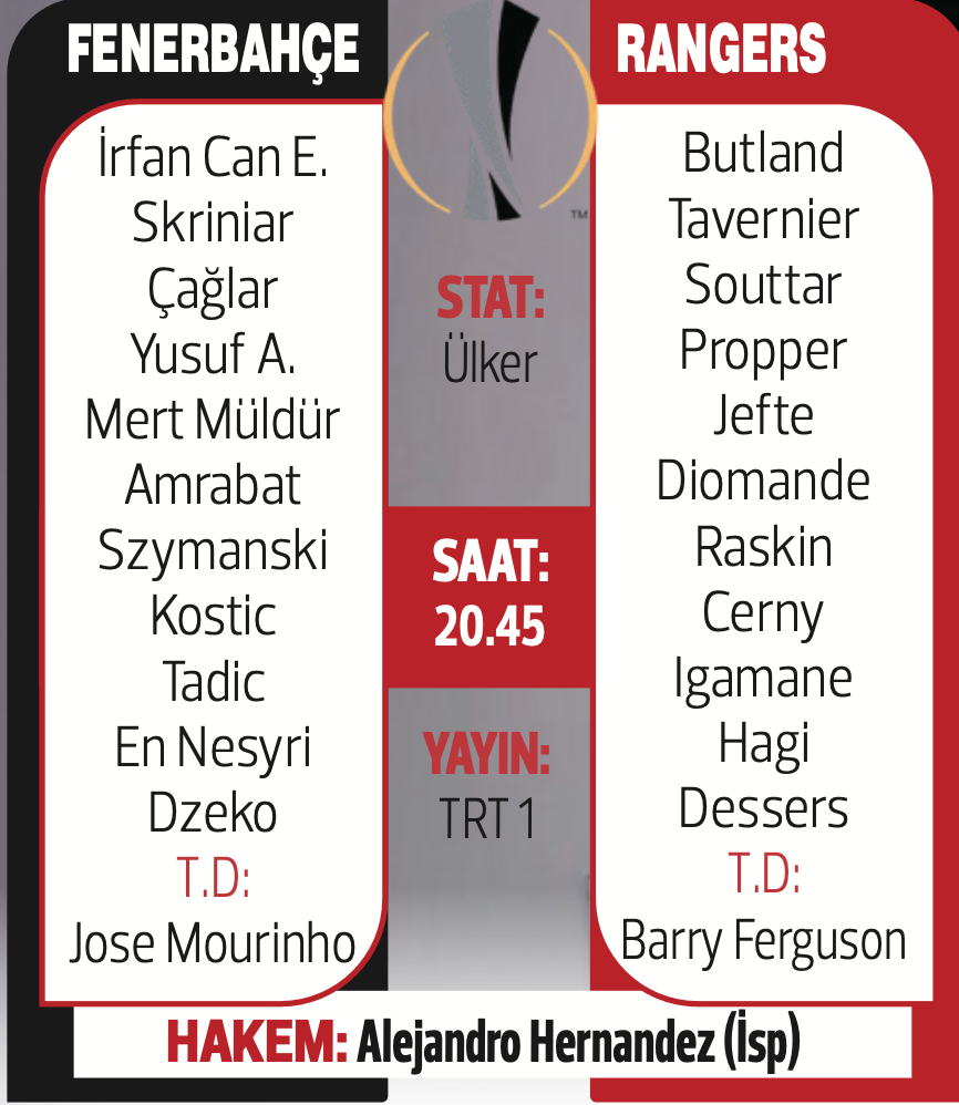 Fenerbahçe, UEFA Avrupa Ligi son 16 turu ilk maçında bugün İskoçya temsilcisi Rangers'ı ağırlayacak. Ülker Stadı'nda ve saat 20.45'te başlayacak karşılaşmayı İspanyol hakem Alejandro Hernandez yönetecek. Hernandez'in yardımcılıklarını vatandaşları Jose Naranjo ile Guadalupe Porras Ayuso, üstlenecek.