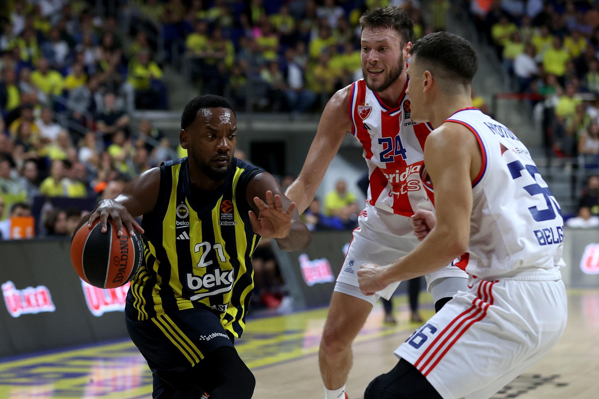 Mücadeleye tutuk başlayan Fenerbahçe Beko, basit top kayıpları yaparken ilk bölümde Kızılyıldız 7-0 seri yakaladı. Molanın ardından sarı-lacivertli ekip Nigel Hayes-Davis'le 5 sayı bulurken, Kızılyıldız ise özellikle dış atışlardaki isabet yüzdesiyle farkı 12 sayıya yükseltti: 5-17.