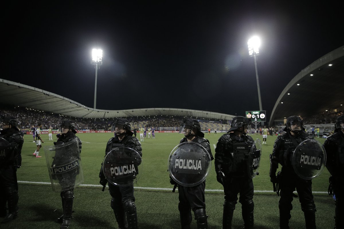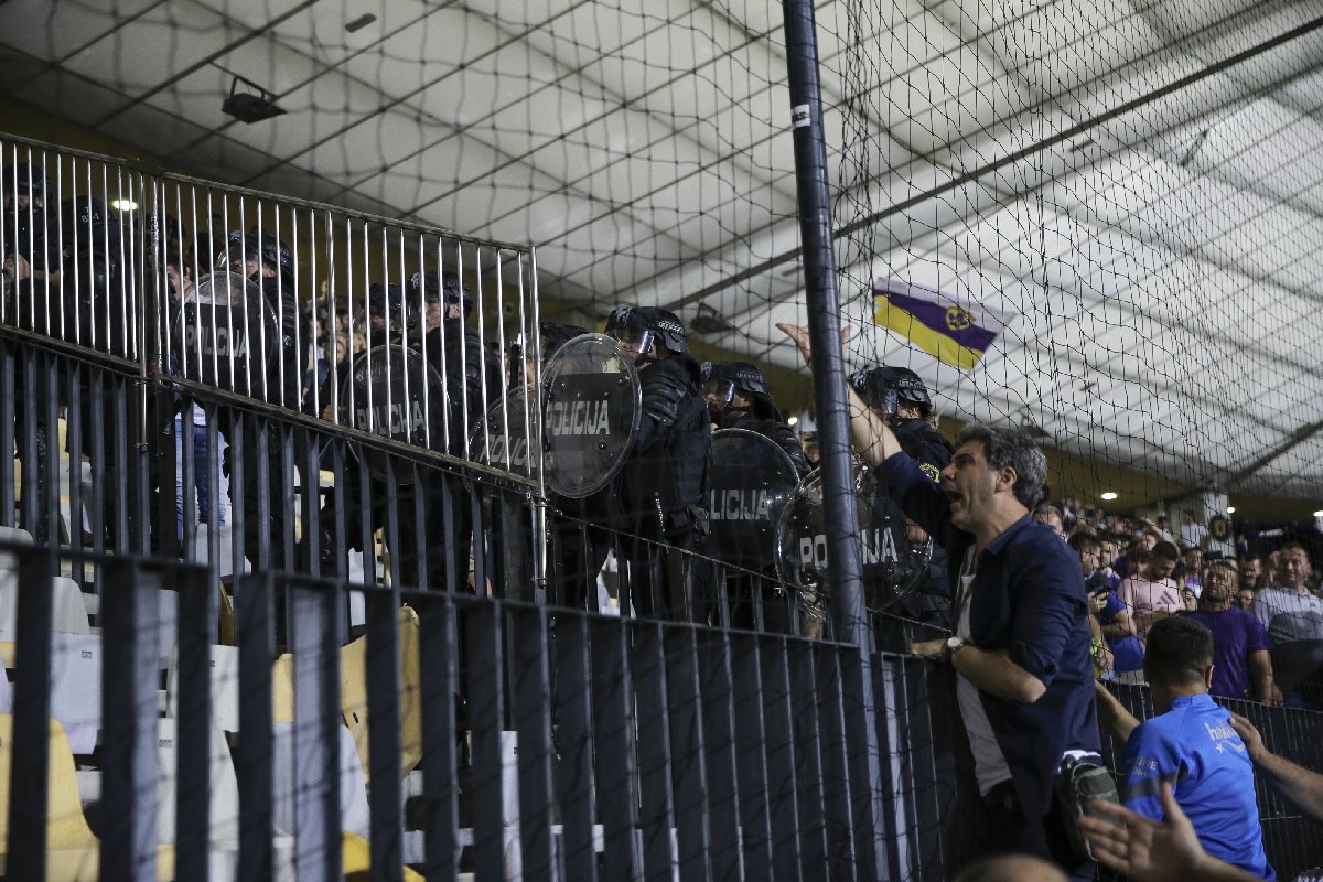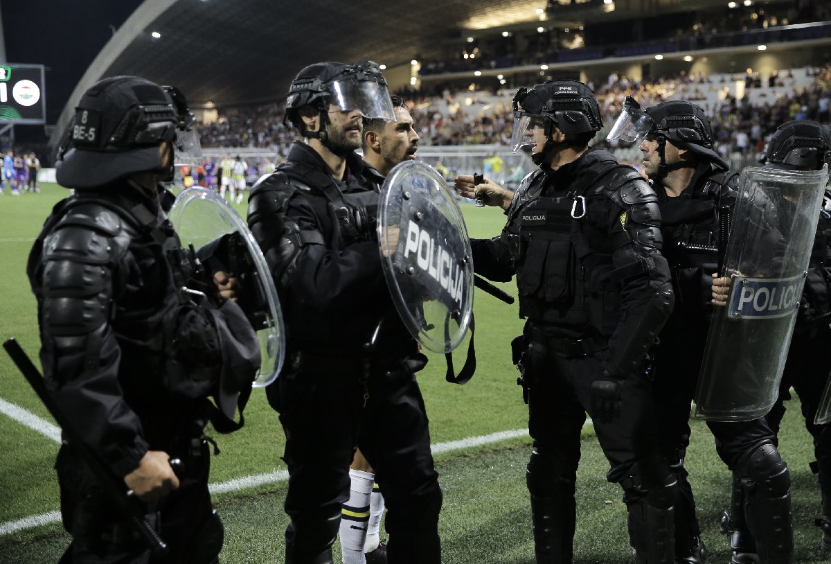 Ancak ilk yarıda kaleci İrfan Can Eğribayat'ın kafasına yabancı madde atan Sloven ekibin taraftarları, ikinci yarının 66. dakikasında Fenerbahçeli taraftarların olduğu tribüne saldırmaya kalkınca ortalık karıştı.