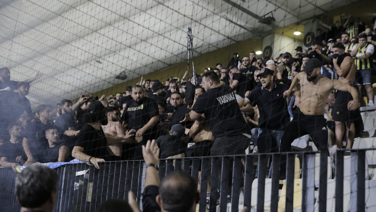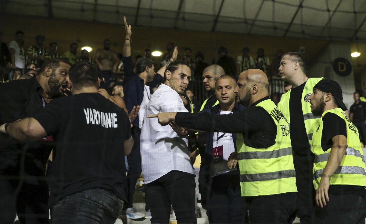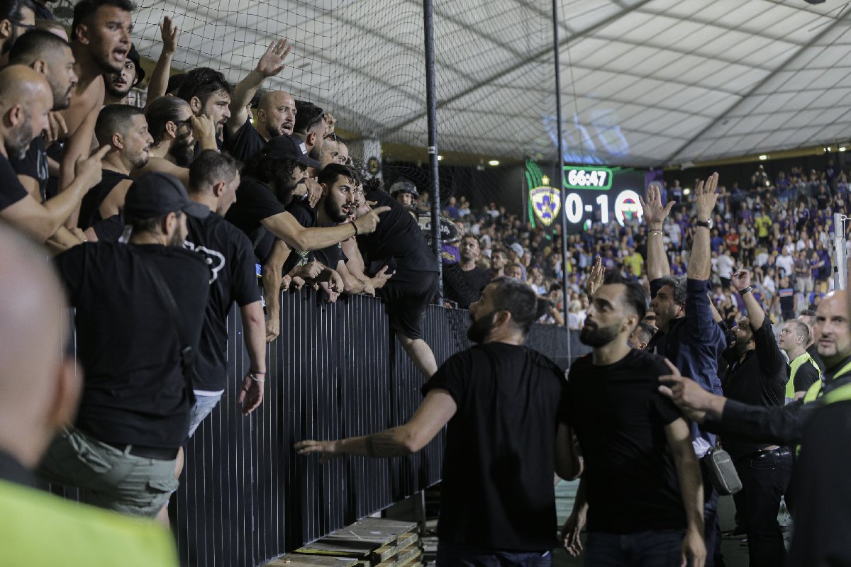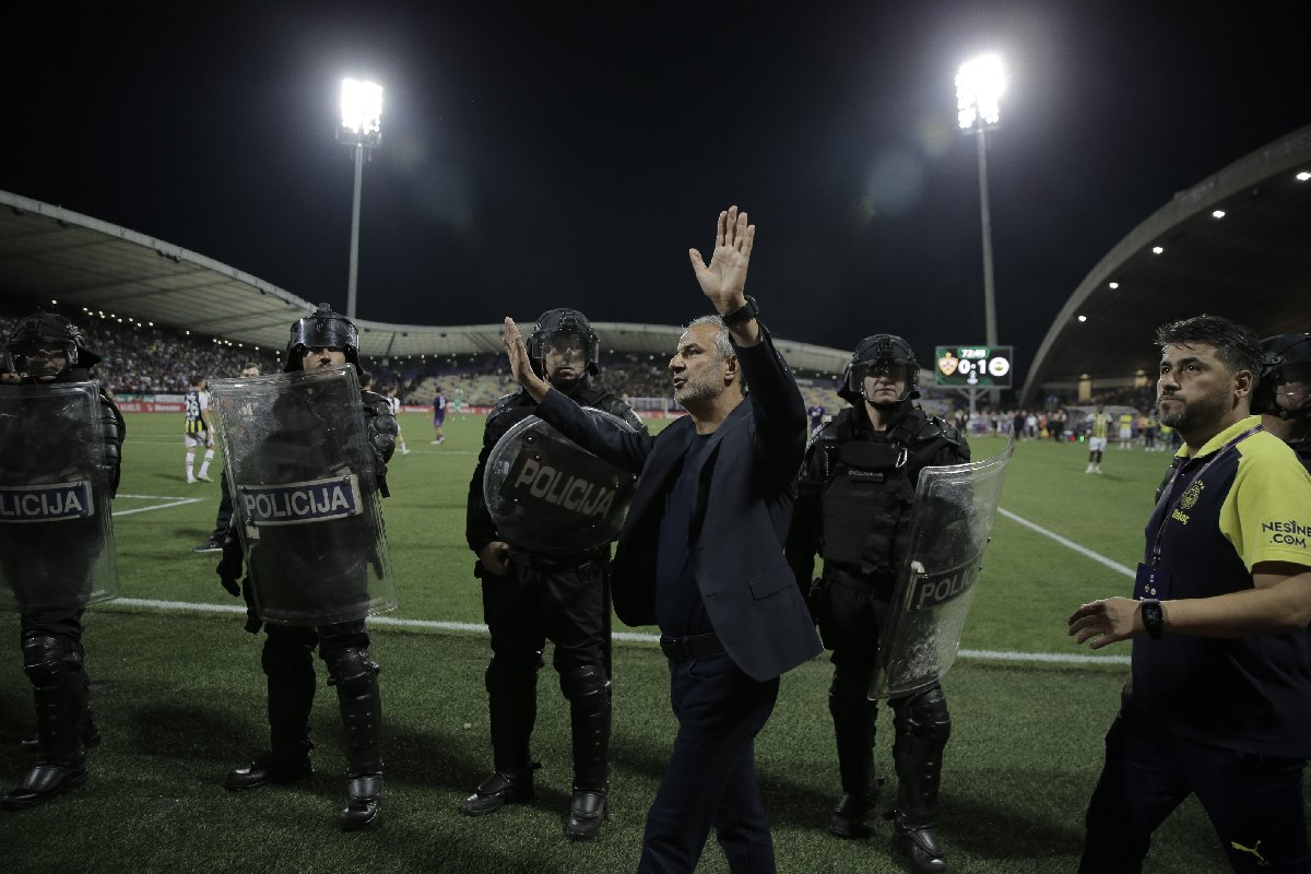 Ancak ilk yarıda kaleci İrfan Can Eğribayat'ın kafasına yabancı madde atan Sloven ekibin taraftarları, ikinci yarının 66. dakikasında Fenerbahçeli taraftarların olduğu tribüne saldırmaya kalkınca ortalık karıştı.