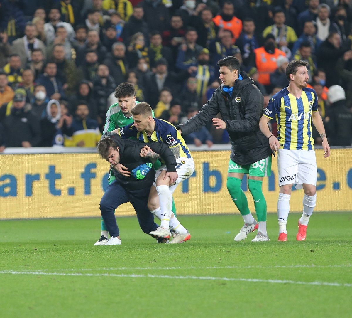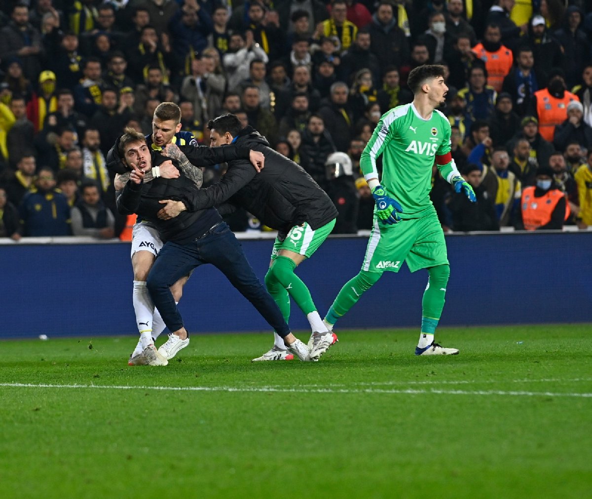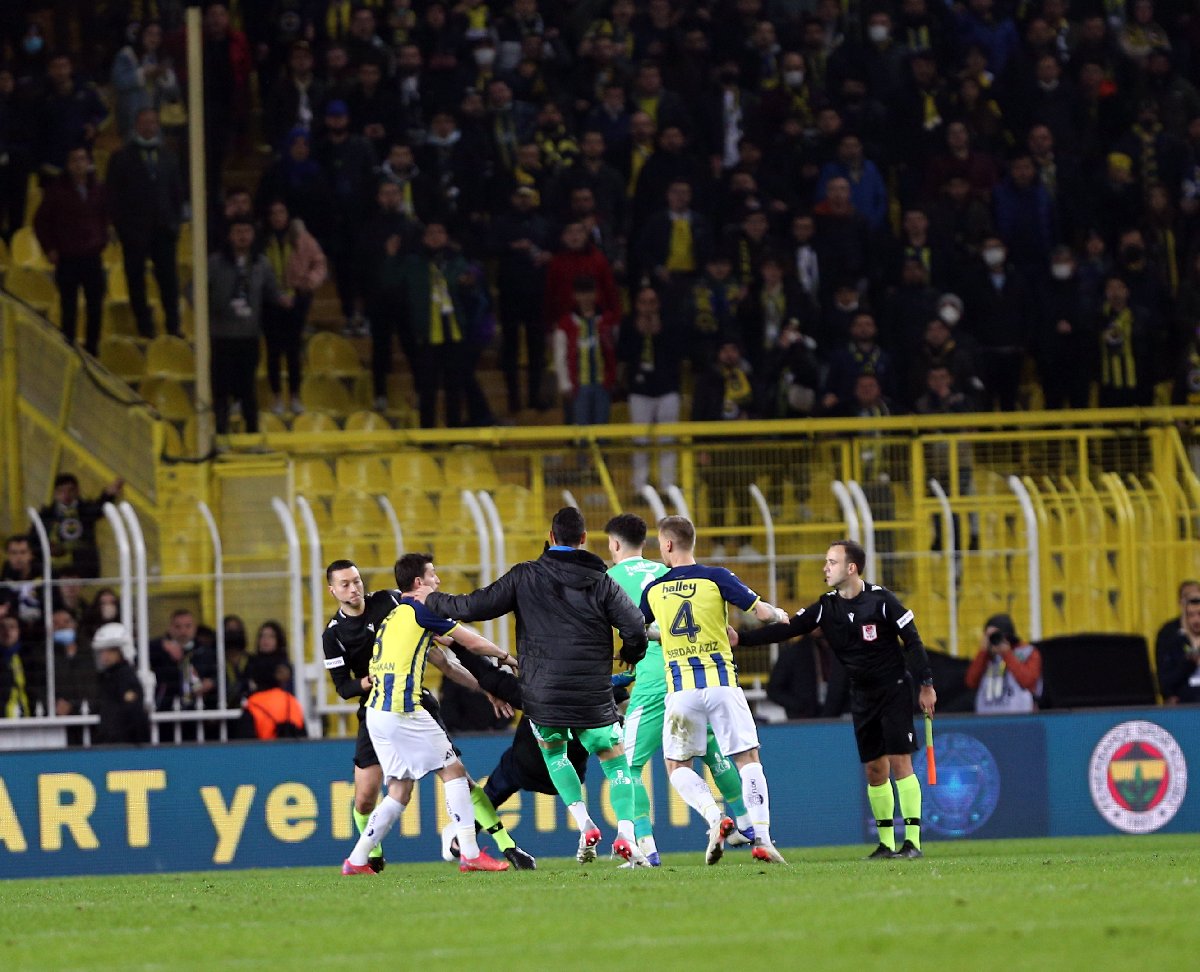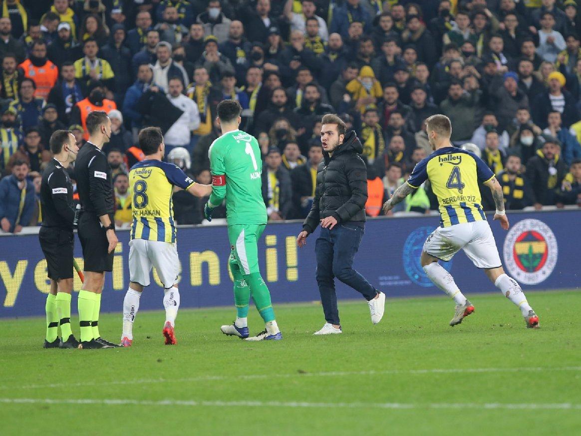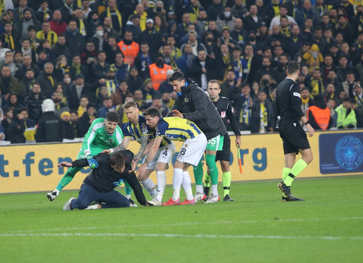 Sahaya girdikten sonra hakem Zorbay Küçük'e doğru koşan taraftar, tam saldırı yapacağı sırada kayarak yere düştü. Saldırgan taraftarın dengesini kaybettiği anda Fenerbahçeli futbolcular olaya müdahale etti. Altay Bayındır, Mert Hakan Yandaş ve Serdar Aziz'in güçlükle sakinleştirmeye çalıştığı taraftarı, güvenlik görevlileri saha dışına çıkardı.