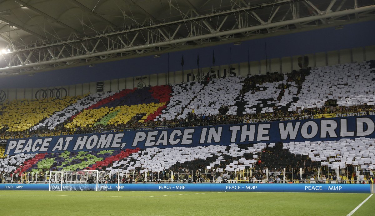 Kiev ile Avrupa Ligi'nde de aynı gruba düşen Fenerbahçe, Ukrayna ekibini bu kez Ulu Önder Mustafa Kemal Atatürk'ün "Yurtta sulh, cihanda sulh" sözünün İngilizce haliyle karşıladı.