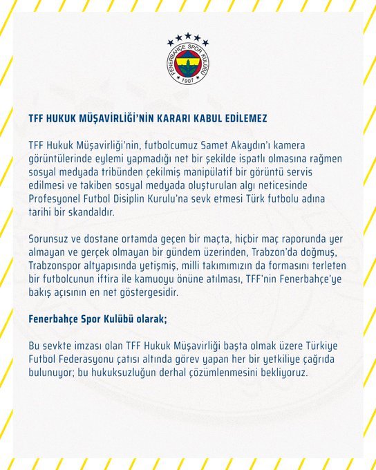 TFF Hukuk Müşavirliği’nin, futbolcumuz Samet Akaydın’ı kamera görüntülerinde eylemi yapmadığı net bir şekilde ispatlı olmasına rağmen sosyal medyada tribünden çekilmiş manipülatif bir görüntü servis edilmesi ve takiben sosyal medyada oluşturulan algı neticesinde Profesyonel Futbol Disiplin Kurulu’na sevk etmesi Türk futbolu adına tarihi bir skandaldır.