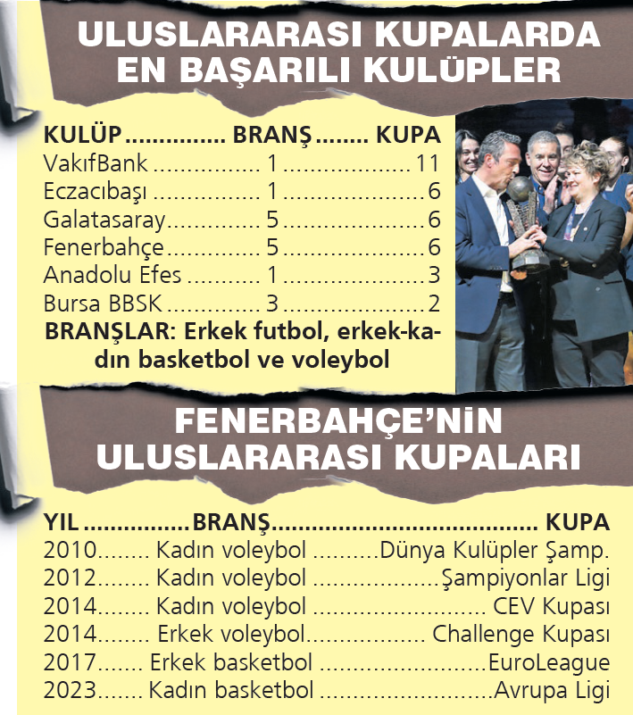 Sarı-lacivertliler, basketbolda 2; voleybolda 4 olmak üzere, yurtdışından toplam 6 kupa getirdi. Kanarya; Kupa 1 seviyesinde Avrupa’da sadece erkek voleybolunda hedefine ulaşamadı ama bu branşta da Kupa 3’ü müzesine götürdü. Amatör sporların zirvesi olimpiyata en çok sporcu gönderen Türk kulübü olan Fenerbahçe; atletizm, yüzme, boks, kürek, yelken ve masa tenisi gibi olimpik branşlarda da elit ve madalyalı sporcular yetiştirerek tarihi misyonunu devam ettiriyor.
