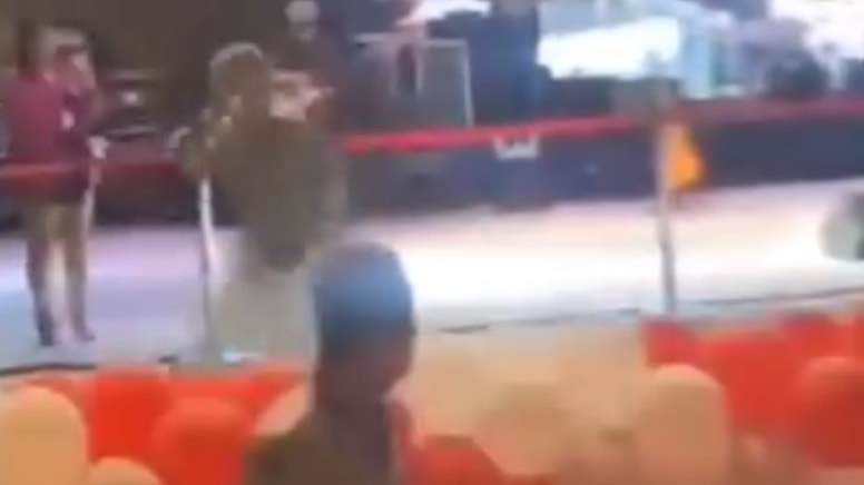 Şarkıcı, görevlilerin yardımıyla ayağa kalkarak konserine devam etti.